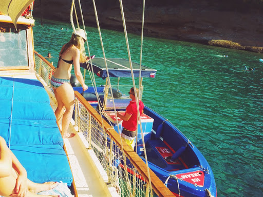 I had the hardest time picking which town we would stay inon the Turkish Riviera because they all offer such different options. But, we stayed right across the street from the marina & Bodrum castle which was nice. The hotel we stayed at, not so much. We woke up our first full day in Bodrum and headed to a tour agency (that became a big part of our time there), & were boarded aboard a traditional Turkish Gullet by 11. We sunned ourselves at the front of the boat as we went to 5 stops along the Bodrum peninsula. Beautiful clear water at every one of them. The last stop was actually a thermal pool and cave with mud to do a mud mask. It was guaranteed to make you appear 15 years younger. The word on the street is that Cleopatra stayed on that peninsula when hiding out for a number of years, and the mud & thermal water from that very cave was one of her beauty secrets. I’m not sure if it was the mud or that story (+ wine), but myself and Kate were convinced our skin felt much smoother. It was an awesome day on the boat & we were sleeping like babies by 9pm.