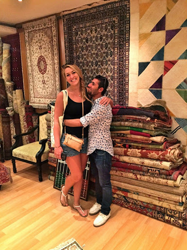 One particular store had 2 younger men standing outside eating vanilla wafers. They offered us a cookie. Apparently that’s the way to win Kate and I over, because next thing I know we were invited in for apple tea, and we’re sitting on a couch surrounded by carpets chatting away with these 2 guys.