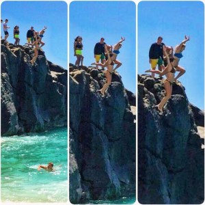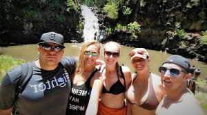 Waimea beach is a beach lovers dream come true. Turquoise waters, a mountain background, Sandy shore, rocks to jump off of, and locals striking up a beach football game. The rock everyone jumps off is quite popular, and quite the rush. It’s a heck of a lot higher in person and looking over the edge. Some of us took a little longer to take the leap than others, ahem… Kate ;).