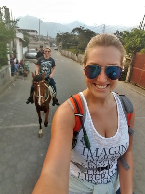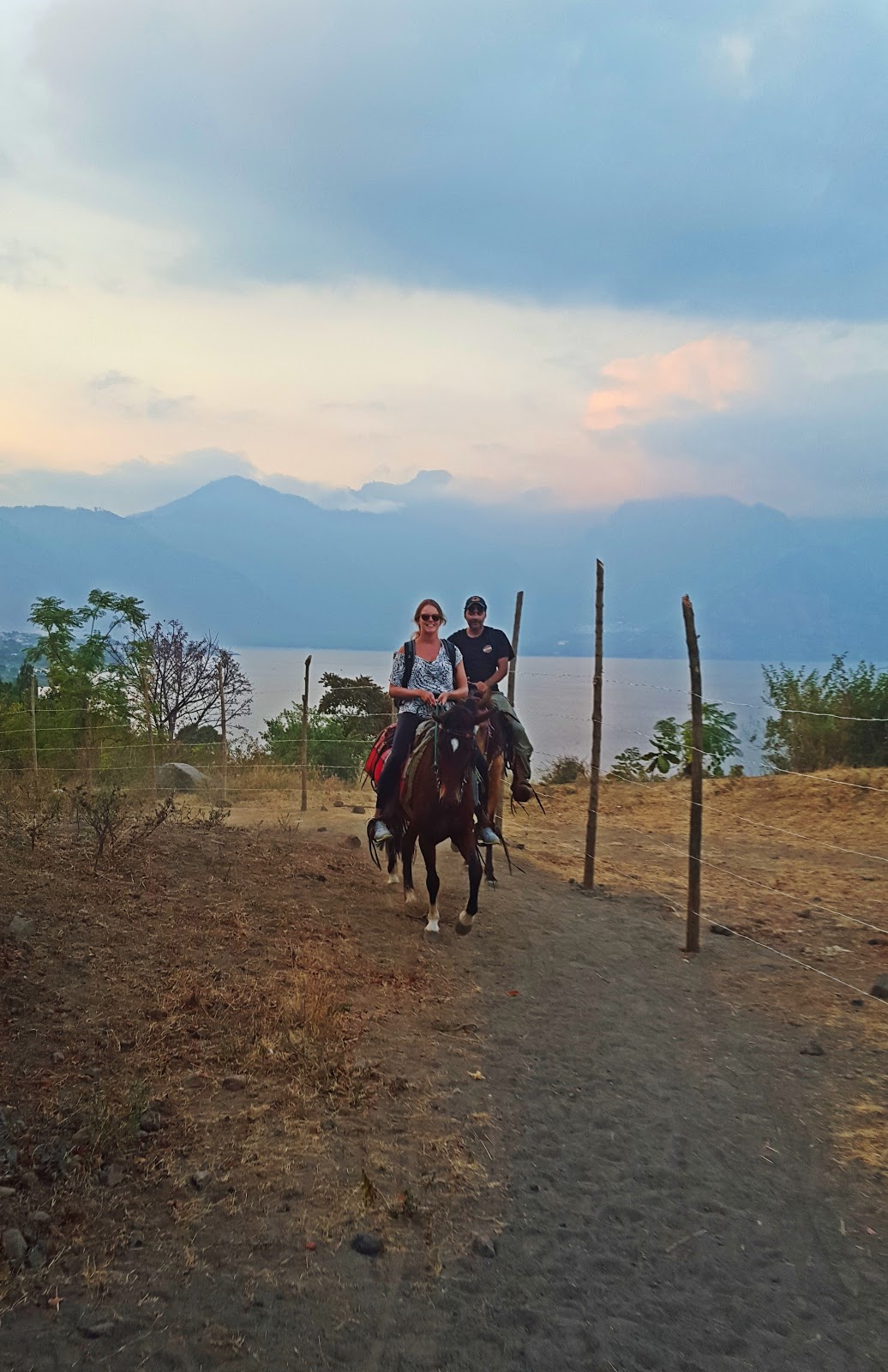 The ride down was nearly as exciting. We just missed the chicken bus down, darn it, and had to hop in the back of a pick up truck. Confused but following our guide, we stood up and held onto the welded metal to hang on. We stopped along the way and picked up locals. I counted 14 in that truck bed by the time we filled up. It was quite the experience, but the views going down the mountain were worth it! Obviously we napped after that lol. We had set a time with Alexi to meet, and of course he was there. We had mentioned how horseback riding would be cool as we hung out for a bit. We went our separate ways only to find out later that he had set up and paid for us to go ride through the coffee plantations. We had made a friend from Amsterdam at the hotel, and she was included in the group outing. The sunset horse back ride was awesome! As someone who never cared for riding horses as a child, I discovered that I loooove it. So much fun!