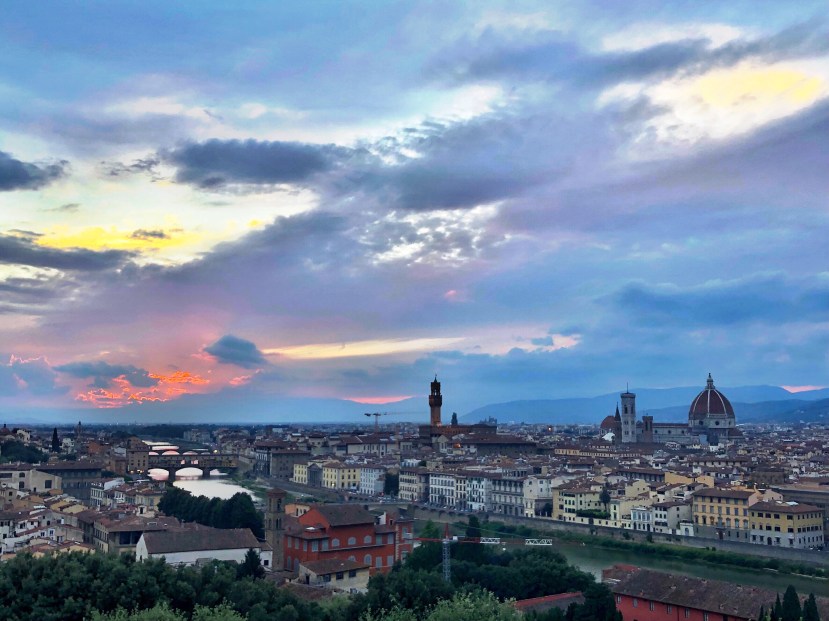 Ok, I didn’t mean to sidetrack into a history lesson, back to La Dolce Vita in Florence. The Michelangelo piazza that sits on the hillside on the other side of the Arno river from the famous Duomo and museums is ideal to sit and relax with a bottle of wine and watch the sunset. Hundreds head up the hill to watch the sunset every evening, so you’ll have a crowd joining you but it’s still worth it. After the aperitifs of course. Another form italians have found to linger over drinks and a meal. A lot of restaurants and bars offer a full buffet of food with your drink during the aperitif hours before dinner. To be honest I’m still not sure how Italian meal times work, nor can I understand how you can possibly be ready for dinner after a buffet and drinks. The evening out with family and friends is meant to take all evening though, I suppose that explains it. Drawn out eating, drinking, & enjoying the company you’re with. How very Italian.
