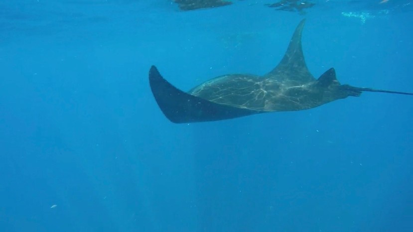 Chad had a much closer encounter. He go go go’ed straight into the water in front of one. Like face to face, giant whale shark mouth open in front and slightly below you. He said he realized it was going straight at him and didn’t want to touch it so he ended up above it and tried to roll to the side over the body of it. The massive tail I just discussed wacked him in the thigh. A couple of people got to see a giant manta ray as well.