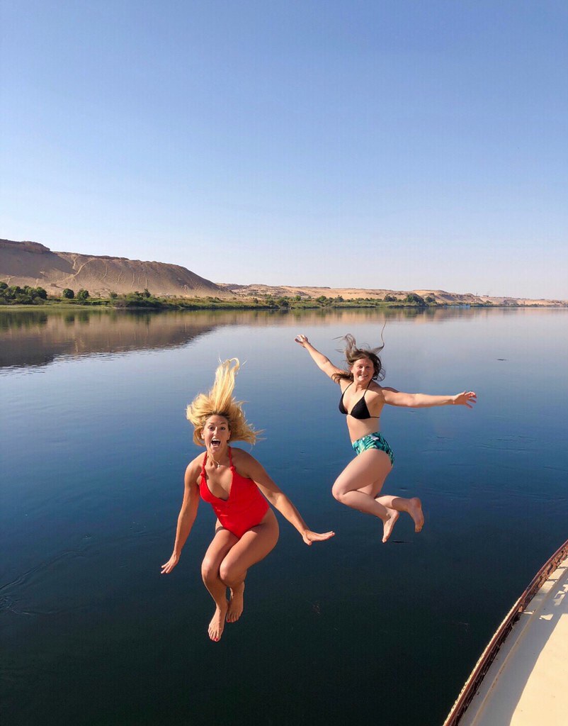 One of my favorite experiences of the entire trip was being on a boat. Not just any boat, but a felucca, a traditional sailboat in Egypt. It’s all open air and the main floor was filled with mattresses stacked side by side and pillows against the windows. It was basically a giant sleepover. AND they stocked the boat with beer and wine that we had ordered. So I got to sunbath on the rooftop of a sailboat drinking a beer while sailing on the Nile River. Then we got to swim in the Nile. I know, I know… but Upper Egypt (it’s actually the south, but is referred to as Upper because of the flow of the Nile) is where the Nile starts and is the freshest, and supposedly there were no crocodiles. Either way, we jumped right in and swam around in the year round freezing water. Family style dinner on the rooftop was finished off with card games and then a bonfire and our crew playing the drums and teaching us dances. Then Monique played drill sergeant, got us in line, and we thought them some dances 😂. A giant sleepover with my girlfriends on the Nile River… it was a dang good day.