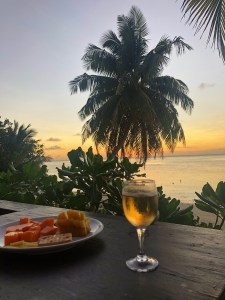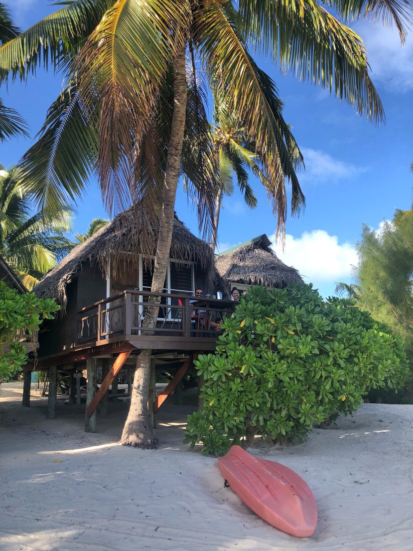 -we posted up on the beach by the Aitutaki lagoon villas as it’s all public except for the few chairs beside the restaurant. You can grab beers from the restaurant and drink on the beach, and the food wasn’t bad there either!