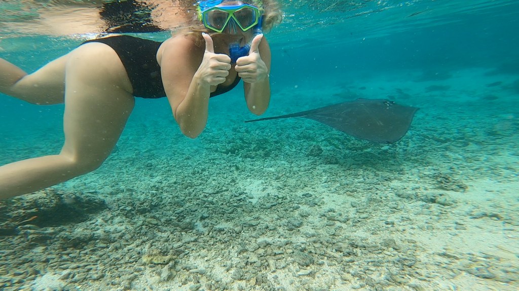 The excursion we did pay for was my surprise highlight of Moorea. Jardin de corail du motu Ahi on the east side of the island was an accidental discovery. We paid $32 and they boated us over to the private little island just off the coast. I can’t speak to what the quality of snorkeling is with the other boat tours, but at 1/5 or more of the price of Viator… I was more than happy. We went to Champion grocery right up the street before and packed ourselves a very hodgepodge lunch of ready to eat food and drinks and we were ready to post up for the day on an island. The snorkeling ended up being wonderful tho! They set up a ropes course just off of the island where you can pull yourself along through the coral. The current was fairly strong, so the ropes were much appreciated. When we got back to the beach, the locals had brought out some bait and a couple of stingrays were just circling around the shallows. That isn’t uncommon without the bait, but they continued to think we were going to be feeding them so they were extremely friendly little puppies coming up to us and swimming around. I hope they have as much fun as we did. The locals invited us back for a DJ party the following evening, but sadly we were leaving to go to Tahiti. So I’m not sure the exact use of this private island, it seemed like it could be a venue space, but there were plenty of tables with shade and a full restroom available as well.