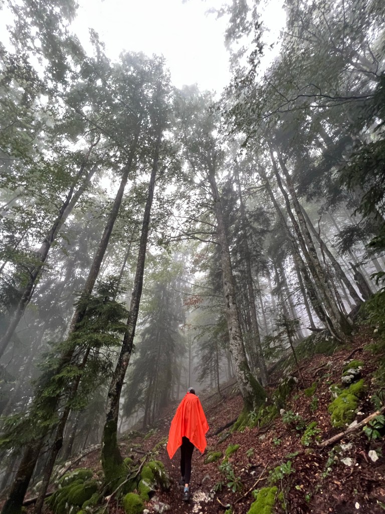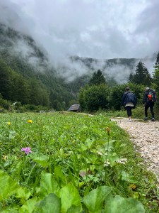 Day one we parked in this lot in Stara Fuzina, https://maps.app.goo.gl/m9kNf3wGsWkZjCyv7?g_st=ic , and started up. The day was cloudy, cold, with misty rain coming down pretty much the entire time. We were climbing up through a dense forest and realized eventually it was also through the clouds. The moisture clinging to everything. The forest (and the low hanging clouds) gave way to the tree line after a series of switchbacks. Finally we got a glimpse of the peaks around us and realized how impressive the views probably were all along the hike. We took off our wet gear and hung it in the drying area of the communal room, bought our $5 tokens for 2 minutes of hot water in the shower and eventually settled down to our meal. Options being pasta bolognese, Mac and cheese pasta, or sausage. But, there was beer, wine, and some strange local herbal liquor the ladies next to us were drinking so we decided to try. Once, that was enough. This was the hut for day one, https://maps.app.goo.gl/oV22XdAKodkDqXoj6?g_st=ic. Majority of the guests staying here were going to summit Triglav, Slovenias highest peak, the next day. For this there were plenty of tours and guide companies to go with, and as someone who has never used climbing gear I would have wanted to go that route if we were summitting.